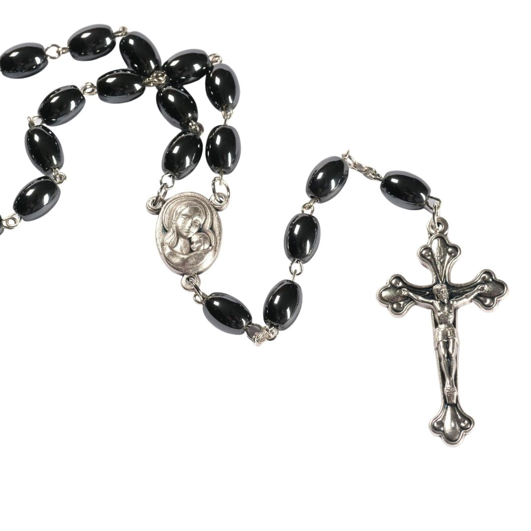 🌿DIESES PRODUKT ist aus Hämatitperlen und Metall. Das Kreuz und die Medaille sind aus Metall.